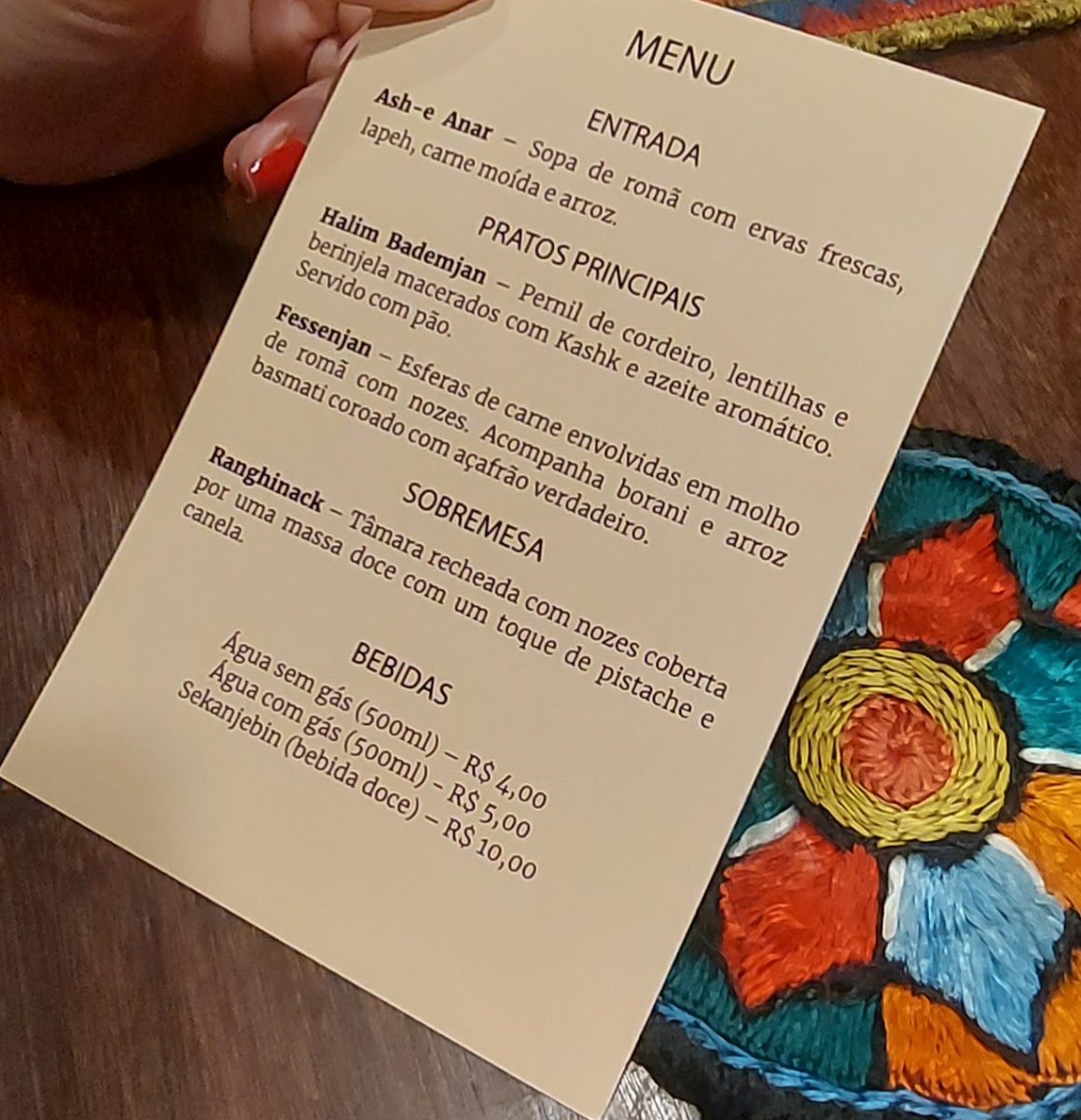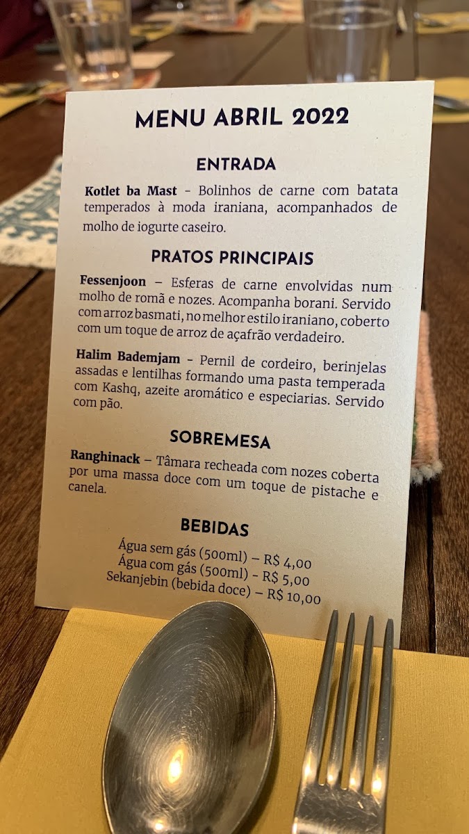 Amigo Do Rei offers a delightful blend of Persian and Brazilian influences, making its menu a unique culinary experience. Among the restaurant's standout dishes, the Ranginack shines with its savory blend of grilled chicken and tangy spices, a perfect choice for anyone seeking a hearty and flavorful meal. For those looking to explore traditional Persian flavors, the Ghormeh Sabzi is an exceptional dish, combining tender lamb with a rich herbal stew that perfectly balances sour and savory notes. Another highlight is the Fessenjan, a decadent Persian stew made with chicken, pomegranate molasses, and ground walnuts, offering a sweet and savory profile that is hard to resist. Lastly, the Sekhanjebin BA Khiar provides a refreshing contrast, featuring a chilled yogurt-based dish with cucumber and mint, ideal for cooling down the palate. These dishes, with their robust flavors and thoughtful combinations, make Amigo Do Rei a standout spot in São Paulo for anyone looking to indulge in authentic Persian cuisine with a local twist.